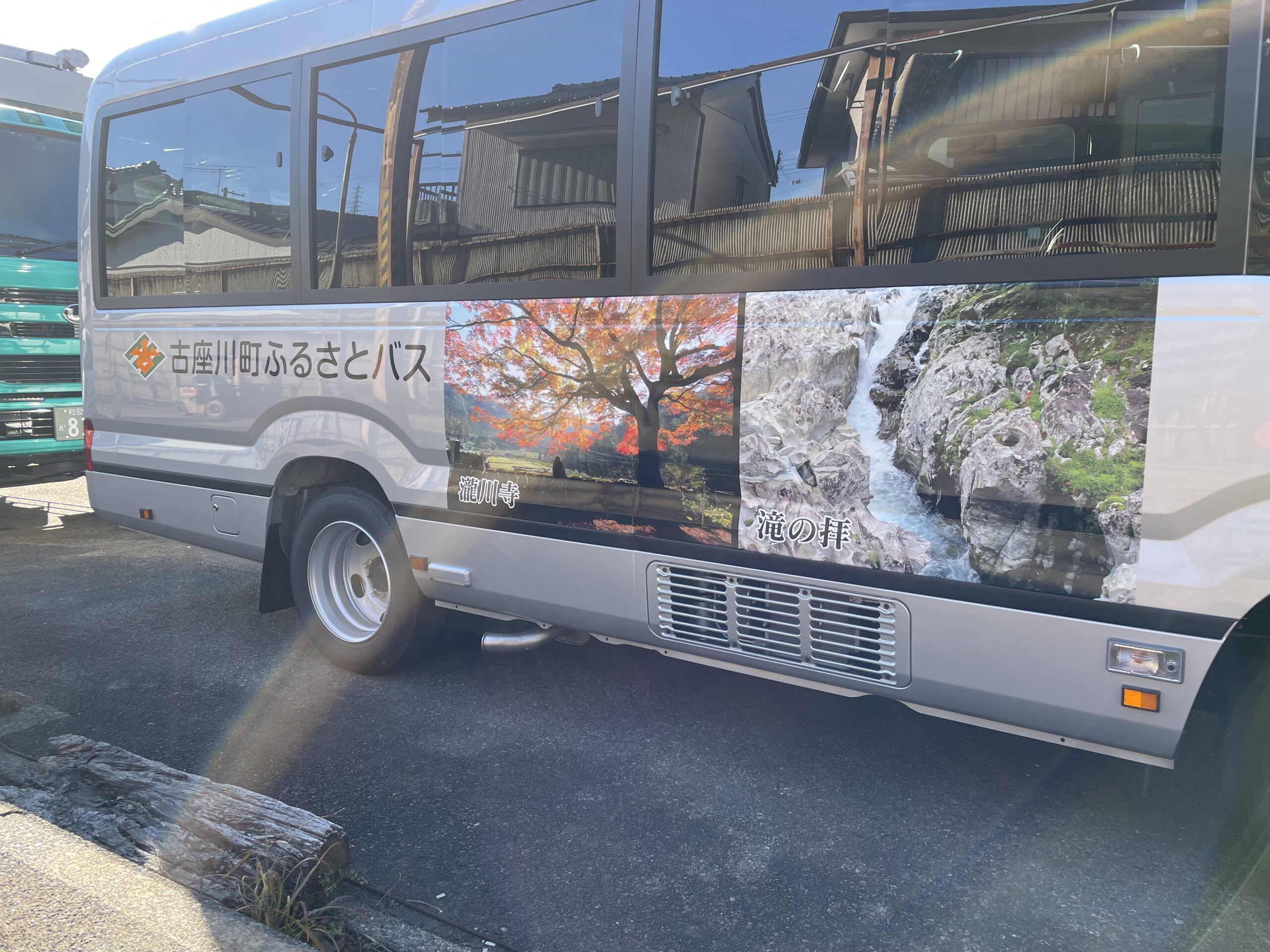 今回の事例では、ふるさとバスの車体に周辺の観光地の写真を表示し、道路を走りながらバスを見た人に地域の美しい観光地を周知できるようなラッピングを施しました。