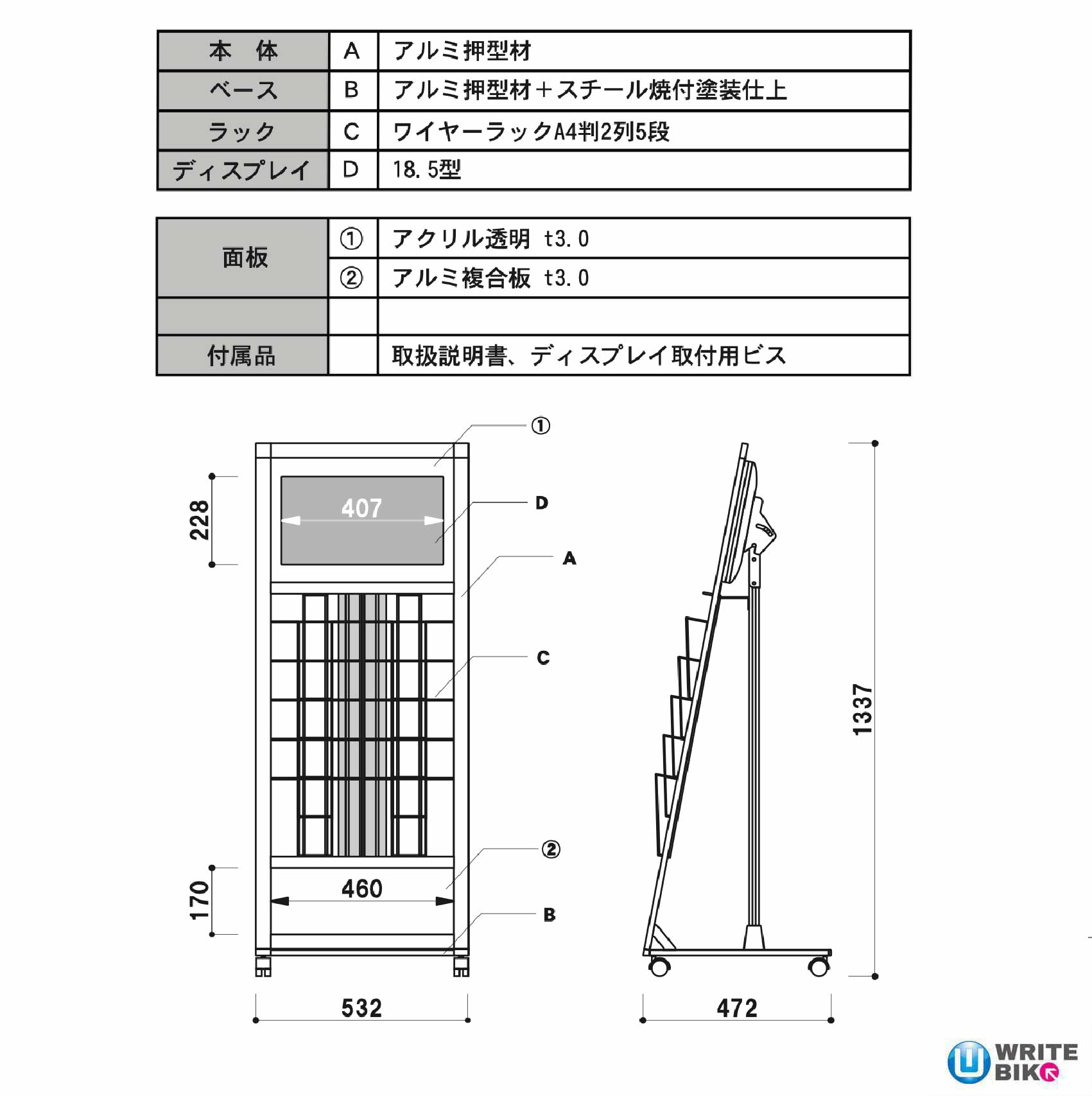 本体サイズH1337×W532×D472mm